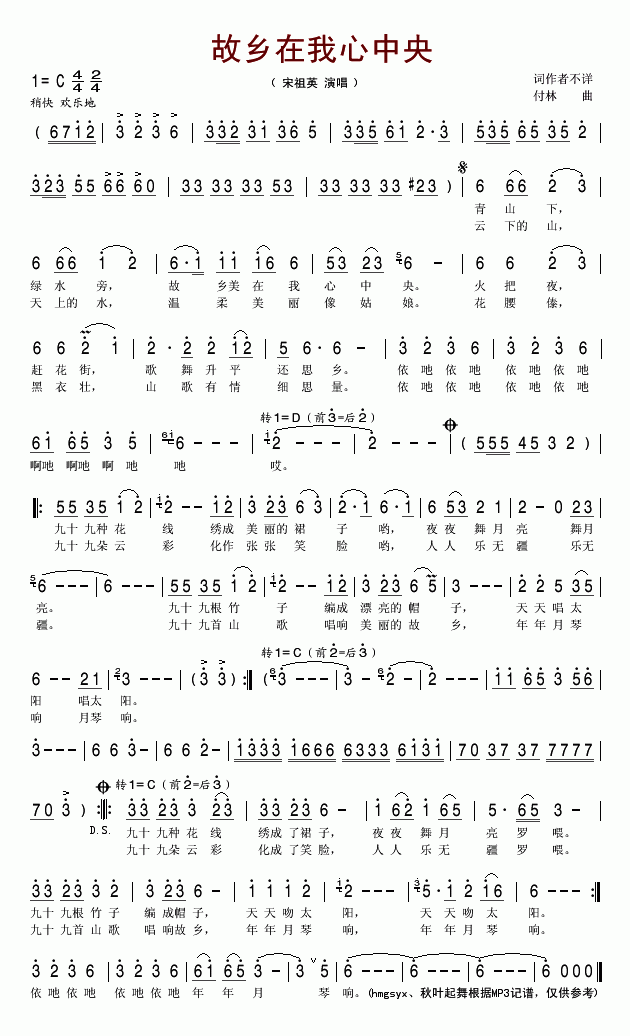 >> 故乡在我心中央-宋祖英(简谱)