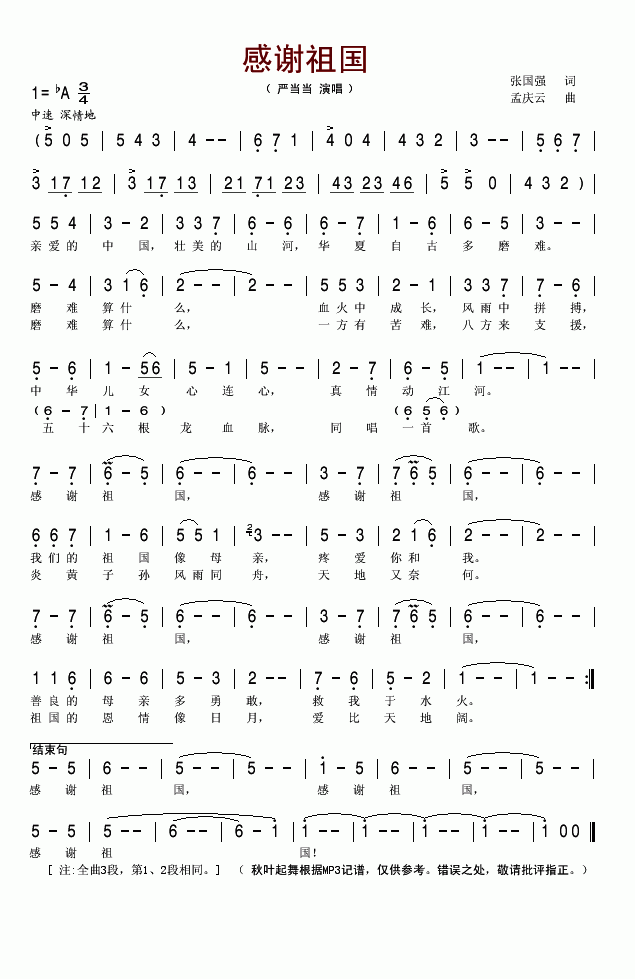 >> 感谢祖国-严当当(简谱)