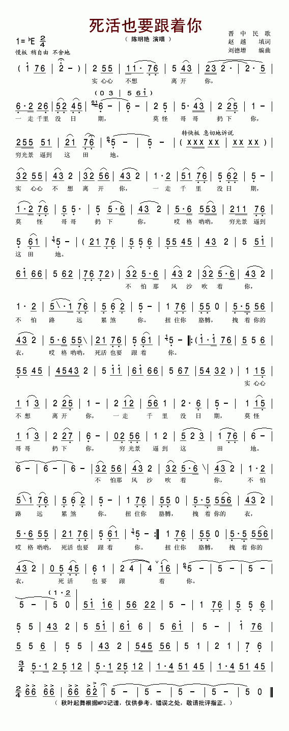 >> 死活也要跟着你-陈艳明(简谱)