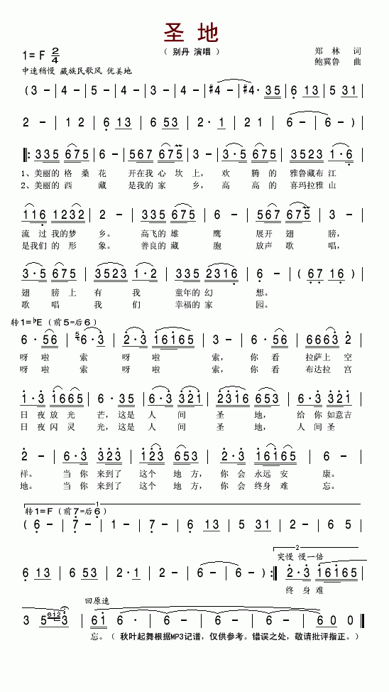 >> 圣地-别丹(简谱)