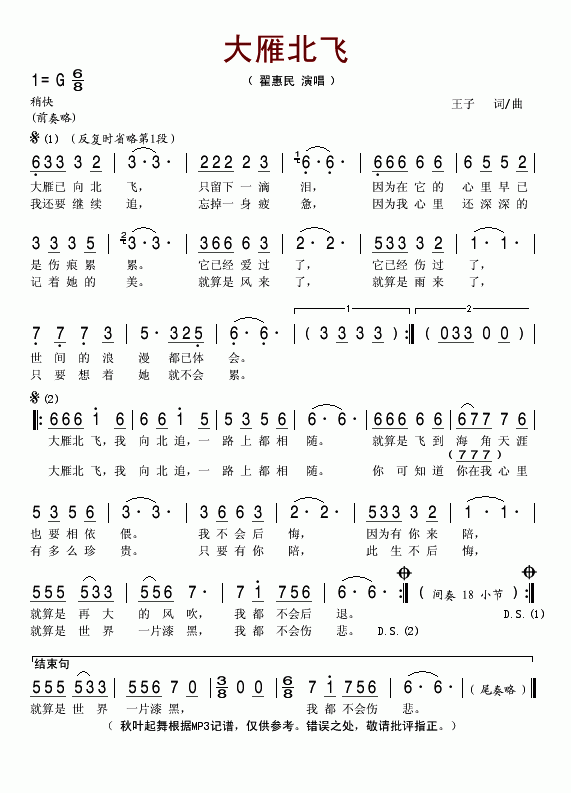 大雁北飞-翟惠民(简谱)
