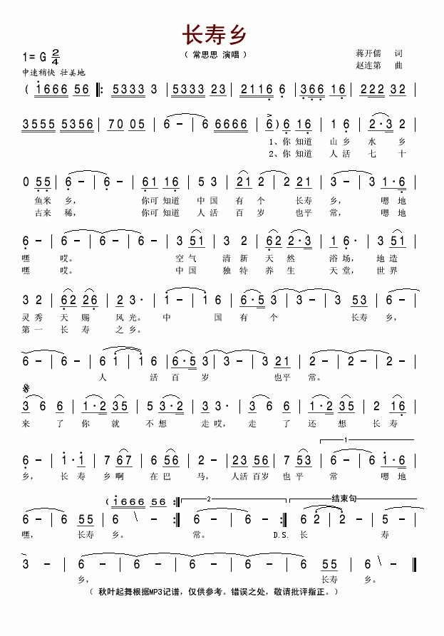 >> 长寿乡-常思思(简谱)