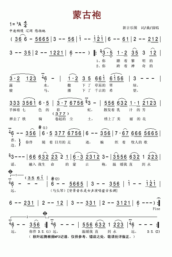 蒙古袍-新吉乐图(简谱)