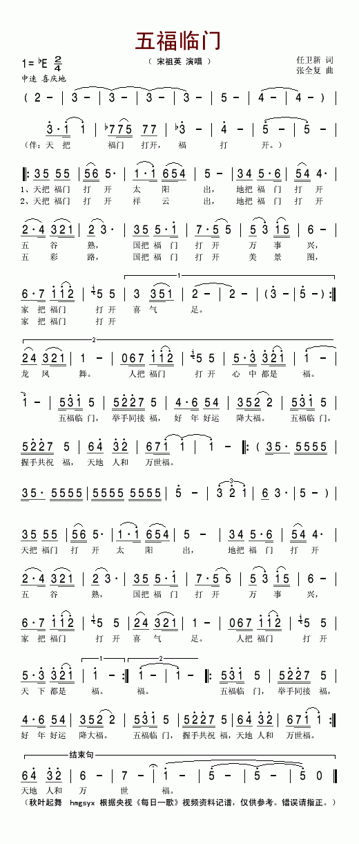 >> 五福临门-宋祖英(新谱二版简谱)