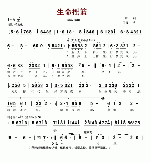 >> 生命摇篮-谭晶(简谱)