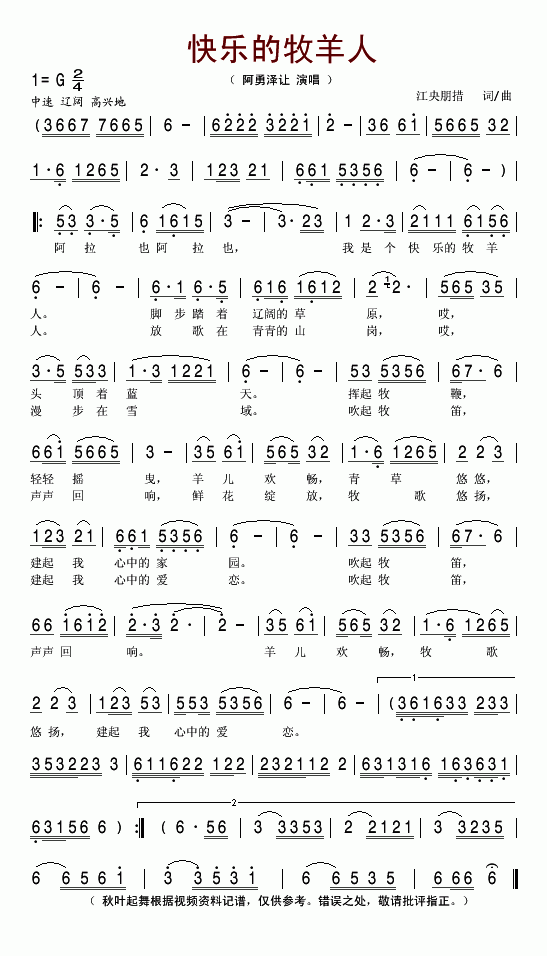 >> 快乐的牧羊人-阿勇泽让(简谱)