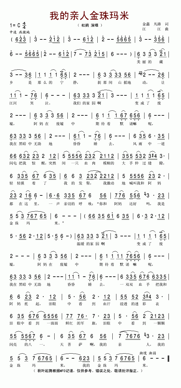 >> 我的亲人金珠玛米-杜鹃(简谱)
