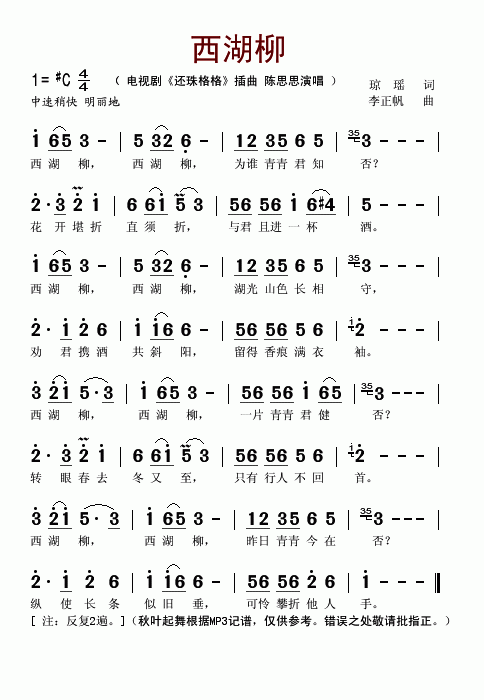 >> 西湖柳-陈思思(电视剧《还珠格格》插曲简谱)
