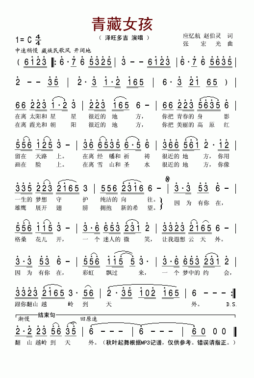 >> 青藏女孩-泽旺多吉(简谱)