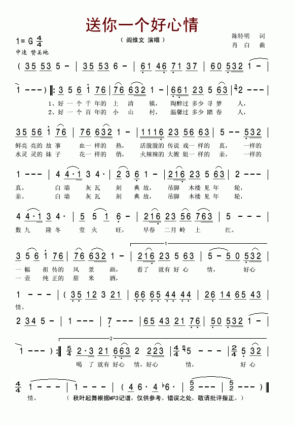>> 送你一个好心情-阎维文(简谱)