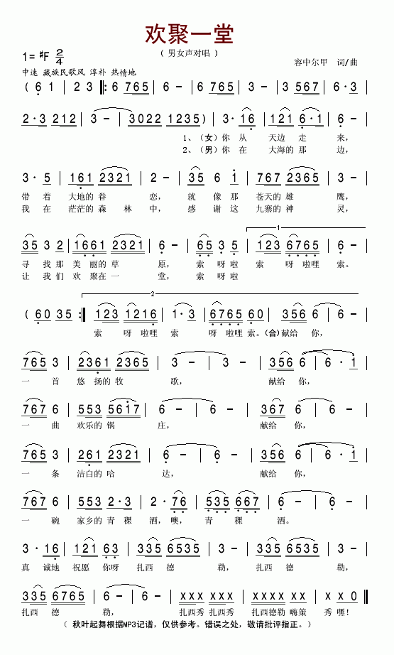 天路情歌-容中尔甲 朱鹏飞(简谱)