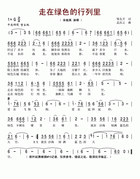 走在绿色的行列里-宋祖英(简谱)