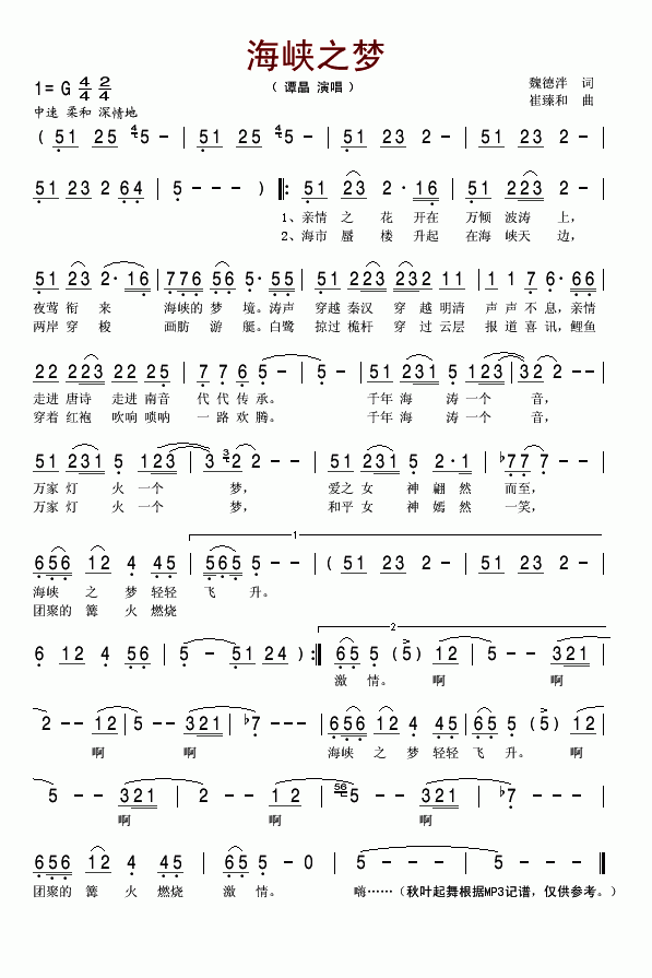 >> 海峡之梦-谭晶(简谱)