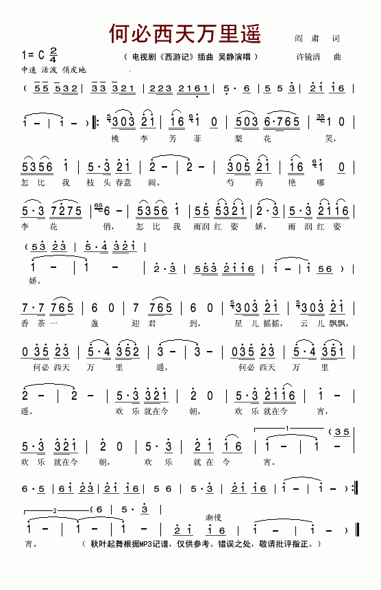 >> 何必西天万里遥-吴静(电视剧《西游记》插曲简谱)