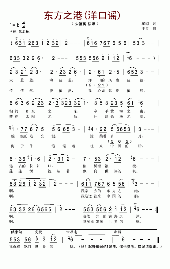 >> 东方之港-宋祖英(洋口谣简谱)