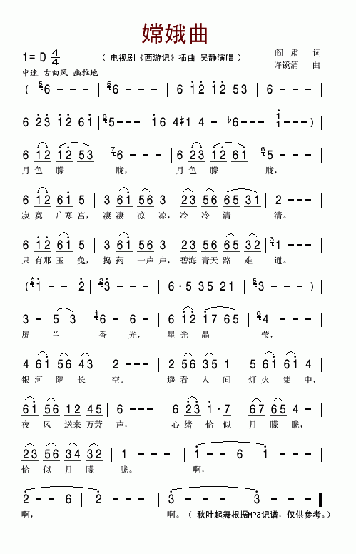 >> 嫦娥曲-吴静(电视剧《西游记》插曲简谱)