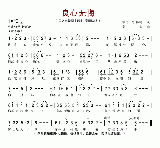 >> 良心无悔-章丽(同名电视剧主题曲简谱)
