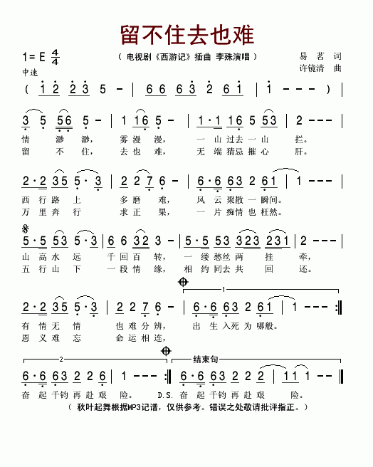 留不住去也难-李殊(电视剧《西游记》插曲简谱)