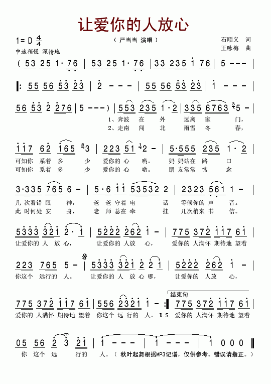 让爱你的人放心-严当当(简谱)