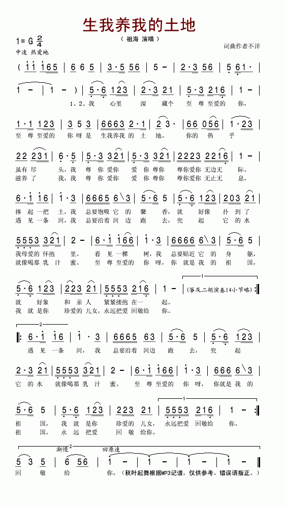 生我养我的土地-祖海(简谱)