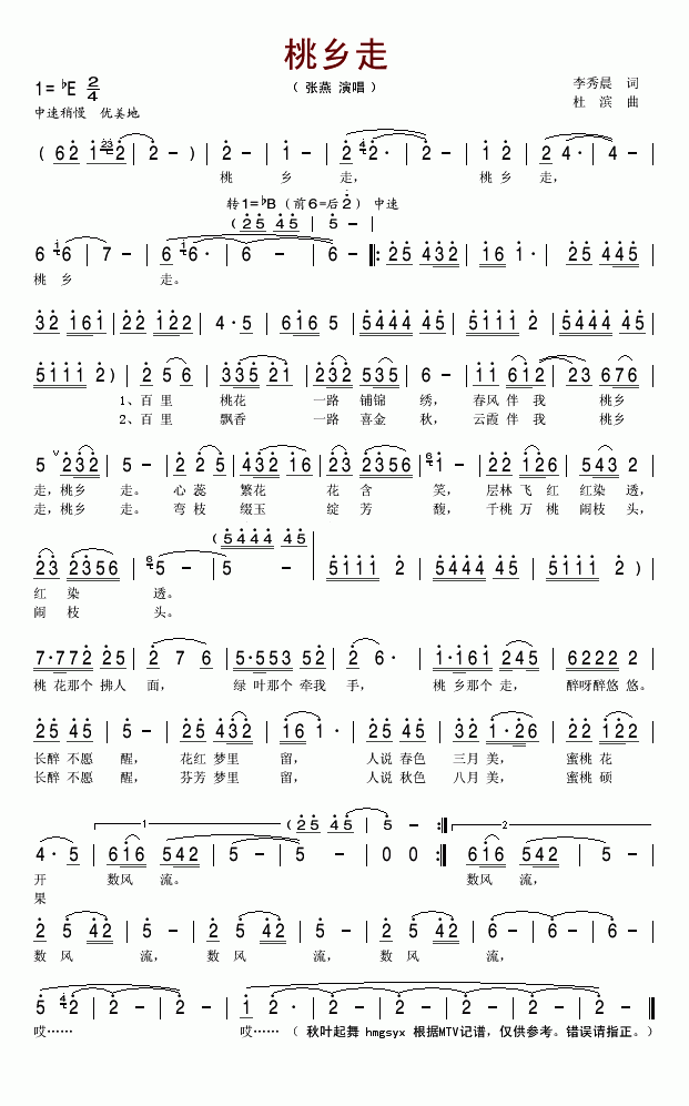 >> 桃乡走-张燕(简谱)