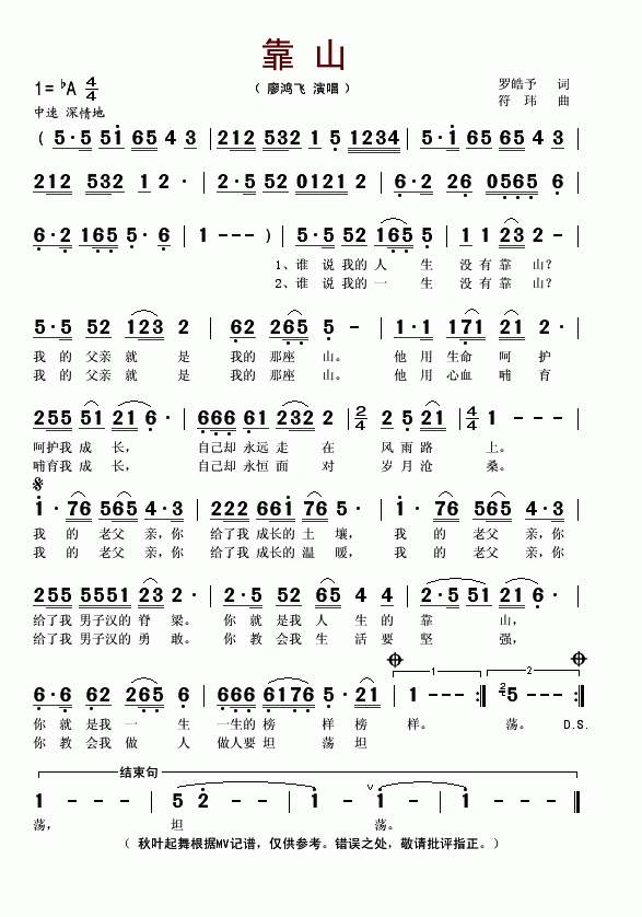 靠山-廖鸿飞(简谱)