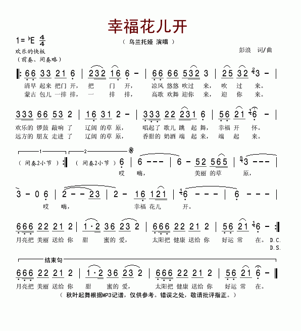 >> 幸福花儿开-乌兰托娅(简谱)