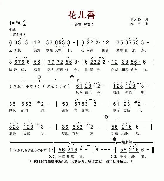 >> 花儿香-春雷(简谱)