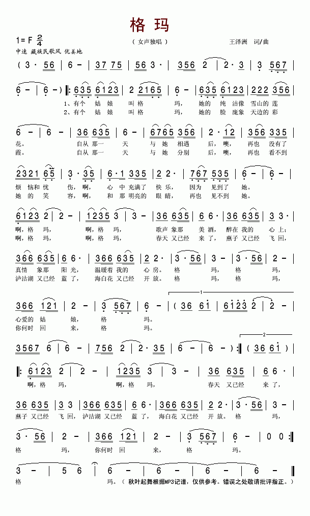 美丽的西藏-女声独唱(钢琴谱_伴奏谱)
