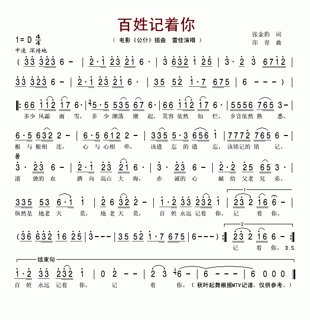 >> 百姓记着你-雷佳(电影《公仆》插曲简谱)