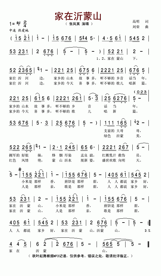 家在沂蒙山-张凤英(简谱)