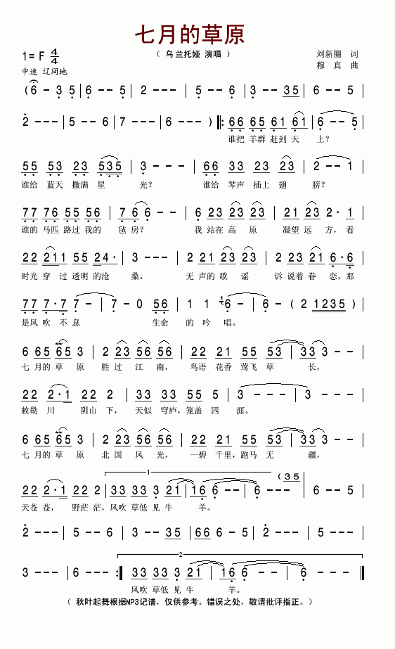 >> 七月的草原-乌兰托娅(简谱)