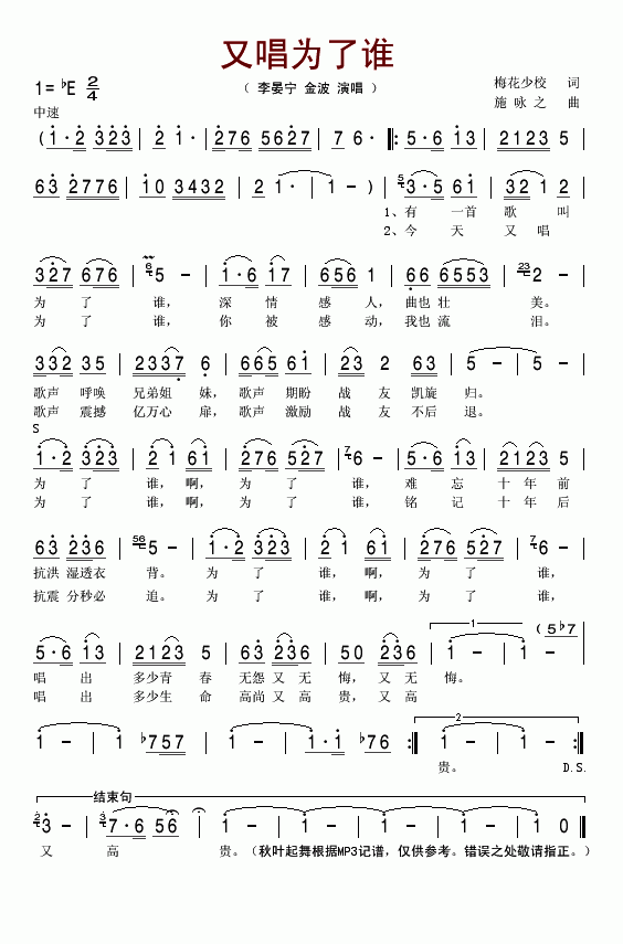 >> 又唱为了谁-李曼宁 金波(简谱)