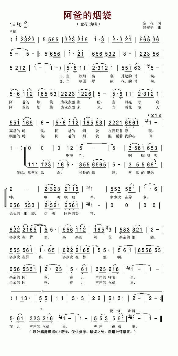 >> 阿爸的烟袋-金花(简谱)
