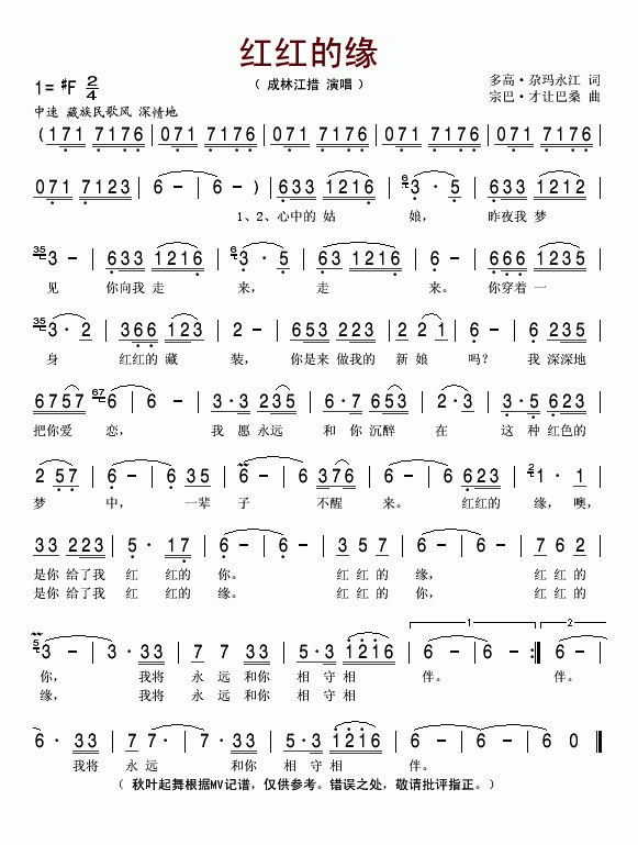 红红的缘简谱 作词:多高·尕玛永江 作曲:宗巴·才让巴桑 演唱:成林江措