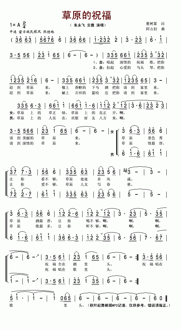 草原的祝福简谱 作词:董树棠 作曲:阿古拉 演唱:朱永飞 云霞