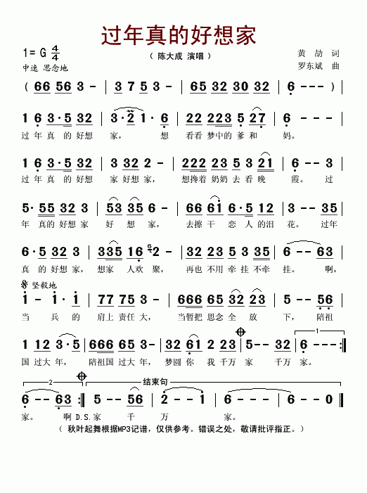 过年真的好想家简谱 作曲:罗东斌 演唱:陈大成