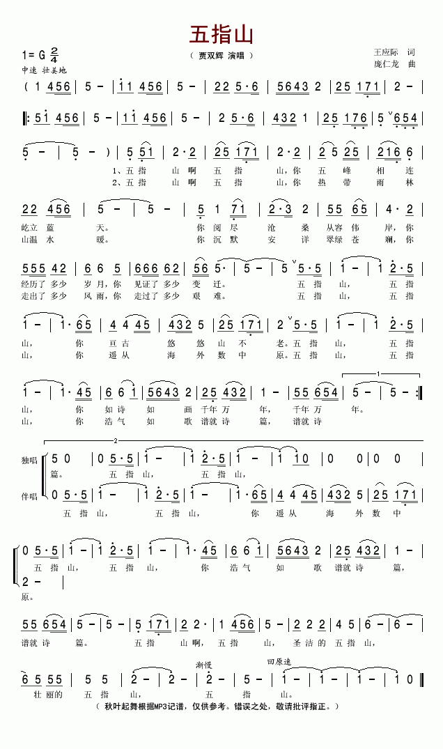 五指山简谱 作词:王应际 作曲:庞仁龙 演唱:贾双辉 记谱:新谱二