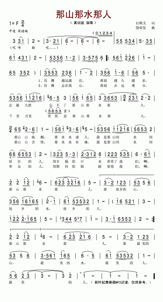 那山那水那人简谱 作词:石顺义 作曲:饶荣发 演唱:黄训国 记谱:新谱二
