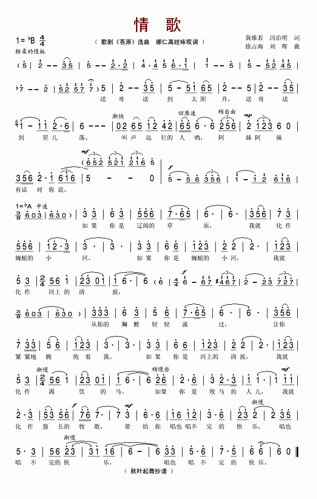 情歌简谱 作词:黄维若 冯泊明 作曲:徐占海 刘晖