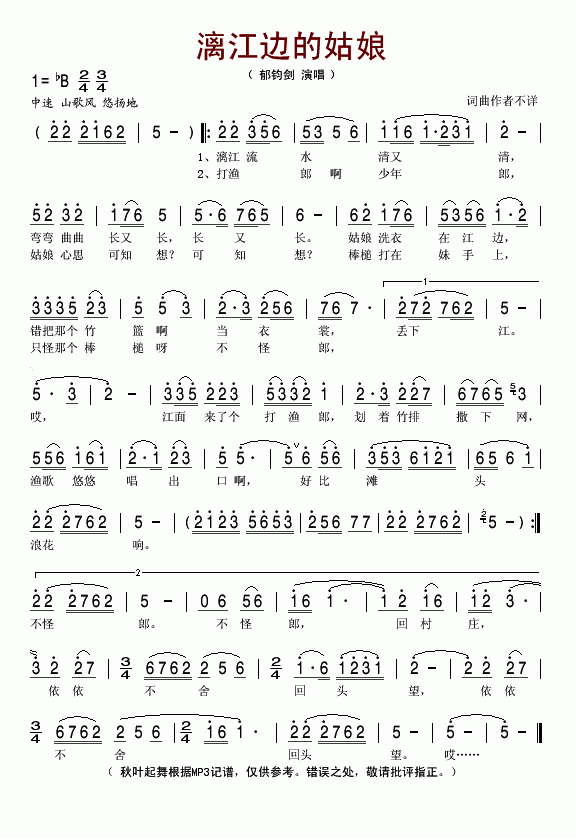 漓江边的姑娘简谱 演唱:郁钧剑 记谱:新谱二