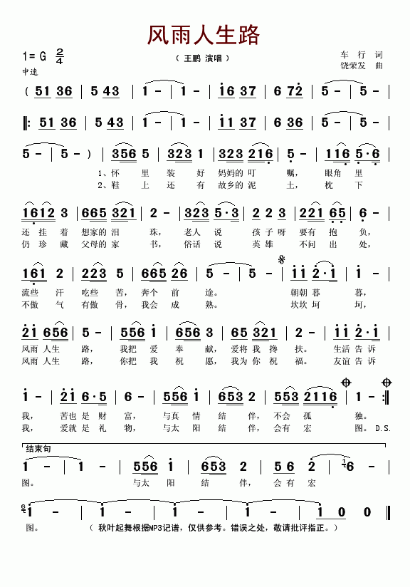 >> 风雨人生路-王鹏(简谱)