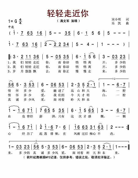 >> 轻轻走近你-满文军(简谱)