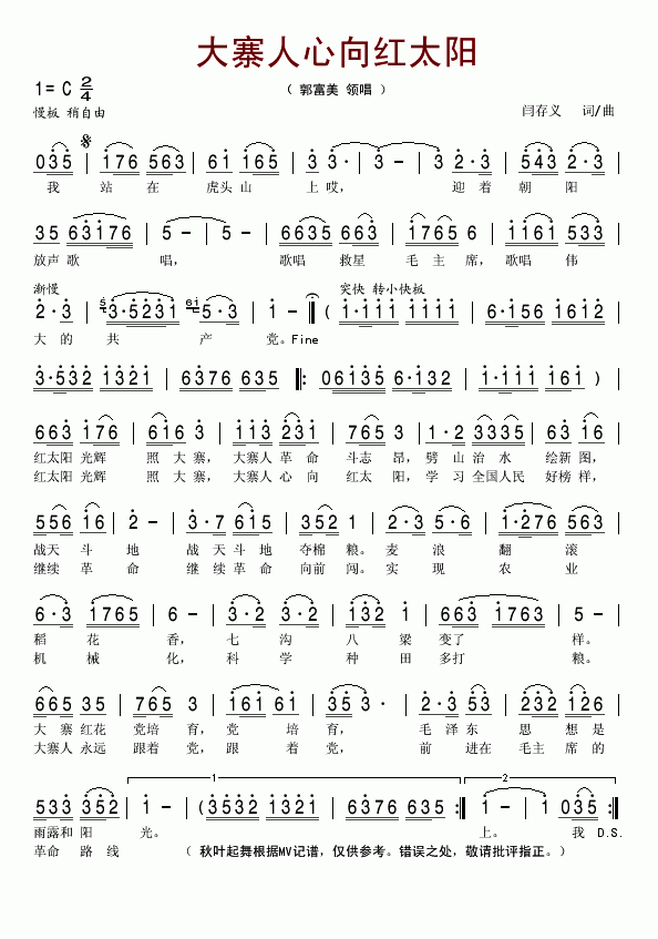 >> 大寨人心向红太阳-郭富美领唱(简谱)