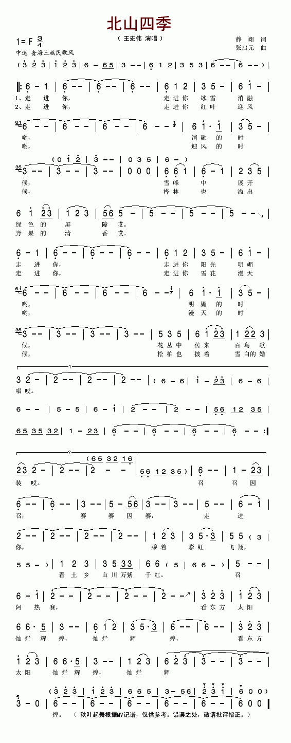 >> 北山四季-王宏伟(简谱)
