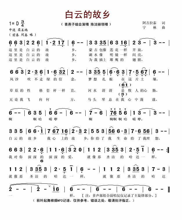 >> 白云的故乡-青燕子组合(简谱)