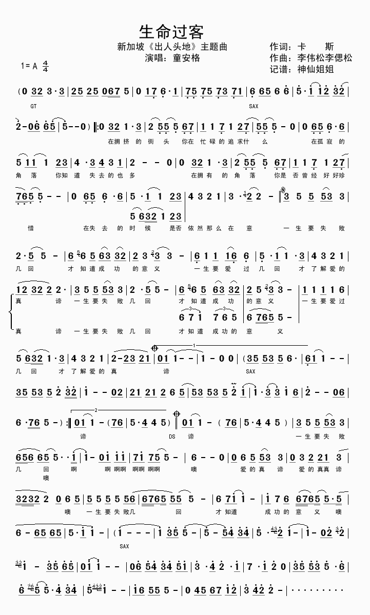 生命过客-童安格(简谱)