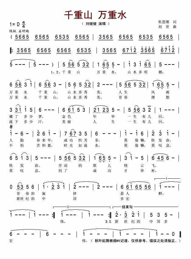 >> 千重山万重水-刘媛媛(简谱)