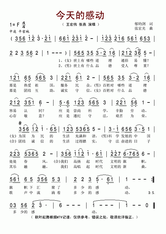>> 今天的感动-王宏伟 张燕(简谱)