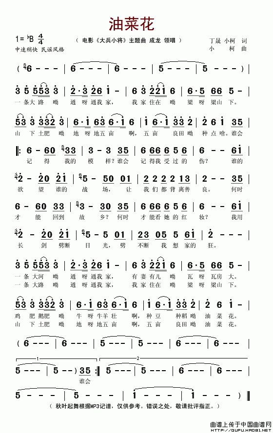 >> 油菜花-成龙 领唱(电影《大兵小将》主题曲简谱)